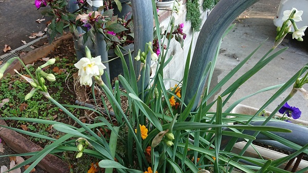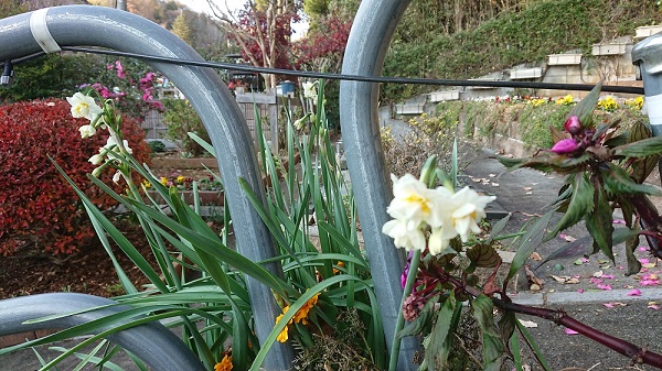 今咲き始めたのたのは、駐車場の北側の中央通路の脇の二ホンスイセンです。
